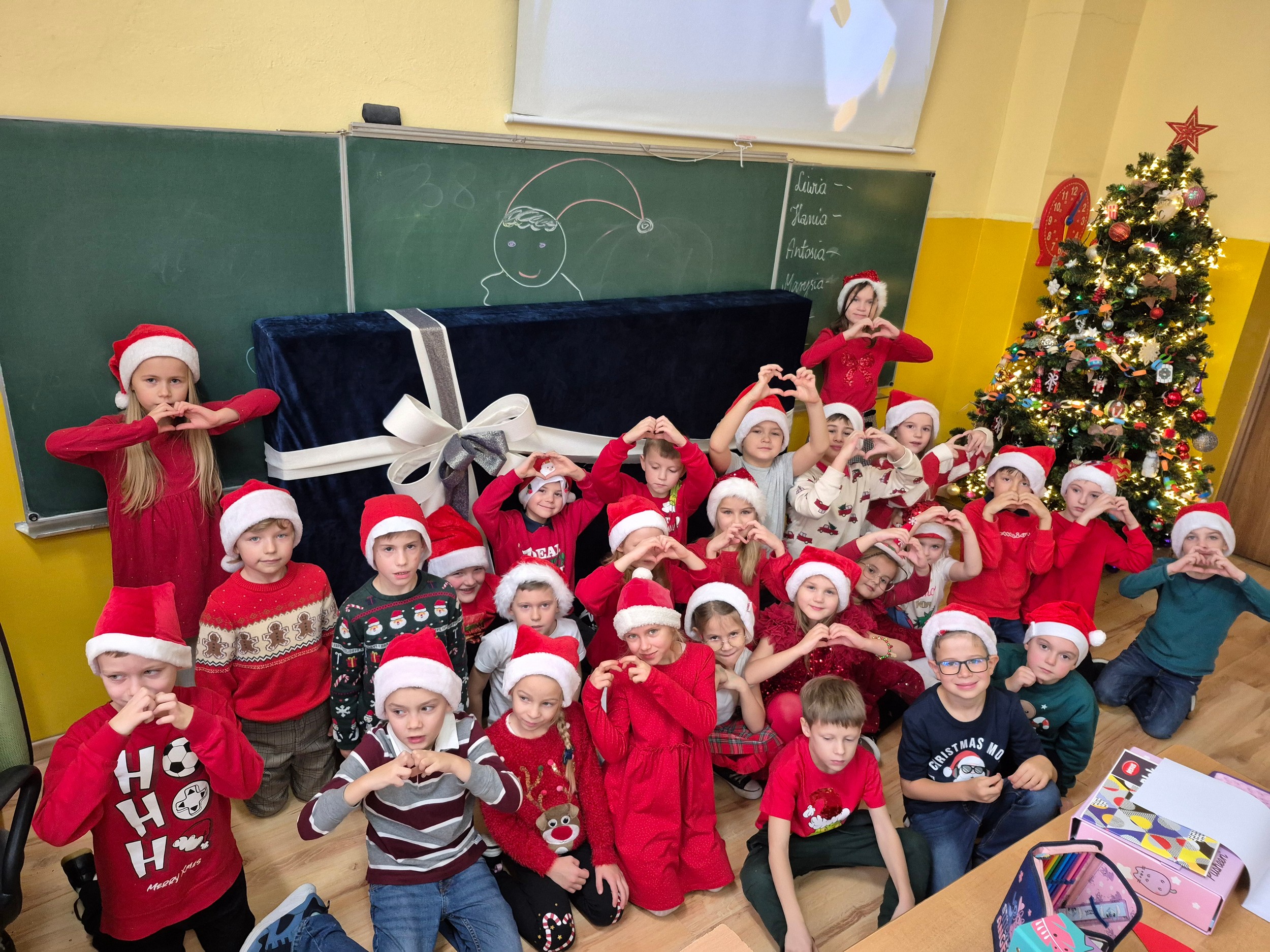 W pewnej chwili ktoś mocno zapukał do drzwi. Uczniowie wybiegli z klasy i zobaczyli białe – mikołajowe ślady, ogromny prezent, słodycze i list. Z pomocą wychowawczyni wciągnęli ciężki prezent do kasy i niecierpliwością zaczęli rozdzierać piękne opakowanie, pod którym kryła się skuteczna i nowoczesna pomoc naukowa.