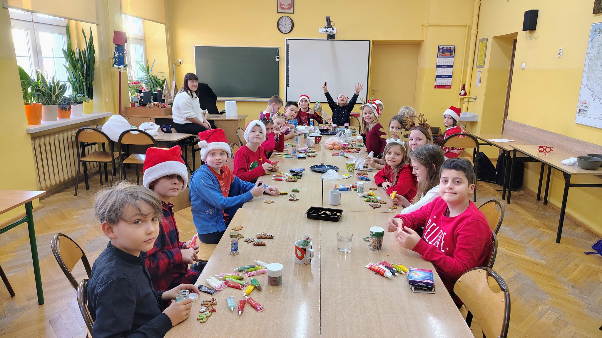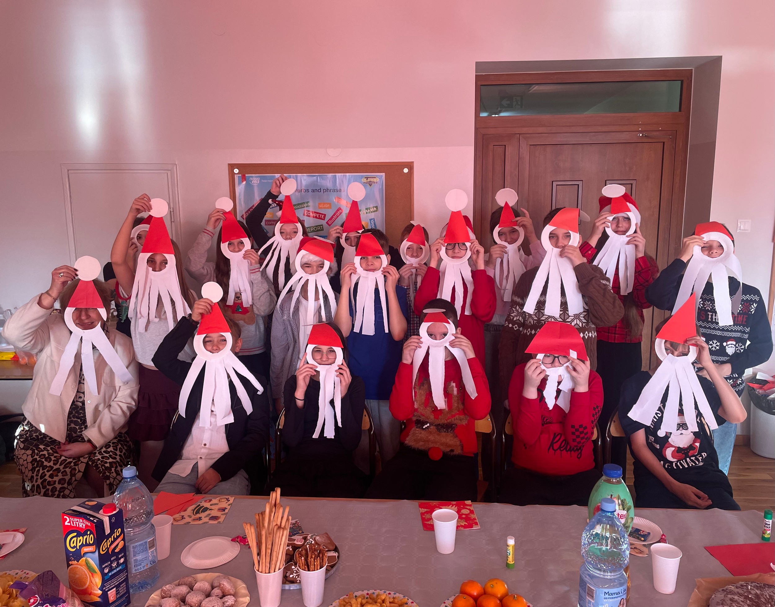 W klasie 5a odbyła się wigilia klasowa. Na świątecznie udekorowanym stole znalazły się potrawy wigilijne – nie zabrakło makowca oraz piernika. Uczniowie wykazali się pomysłowością i kreatywnością, przygotowując mikołajowe maski. Wspólnie podzielili się opłatkiem, składając sobie serdeczne życzenia. Spotkaniu towarzyszyła świąteczna muzyka, która stworzyła miłą, bożonarodzeniową atmosferę.
