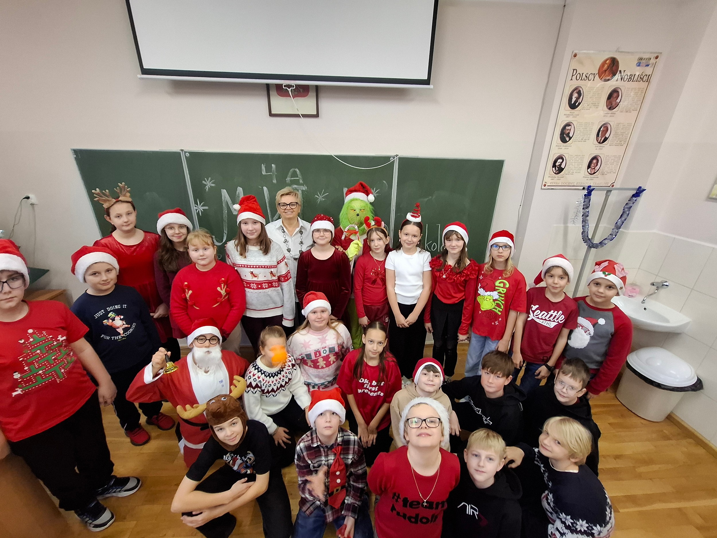 W klasie 4a odbyły się mikołajki. Pod choinką uczniowie znajdowali swoje prezenty. Wszyscy z zaciekawieniem oglądali niespodzianki, czemu towarzyszyła ogromna radość. Nagle do drzwi zapukał szkolny Mikołaj, który przyprowadził ze sobą niezwykłego gościa -Grincha. Śmiechom nie było końca. To była wspaniała zabawa