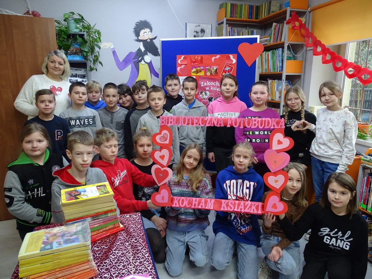 14 lutego nasza biblioteka szkolna przeobraziła się w wyjątkowe miejsce. Tego dnia została wystawiona WALENTYNKOWA FOTOBUDKA pt. „Kocham książki”. W tej niecodziennej, walentynkowej scenerii każdy miłośnik książek mógł zapozować do pamiątkowego zdjęcia. Dodatkową atrakcją były śmieszne rekwizyty: serduszka, okulary, kapelusze, krawaty, smartfony, uśmiechnięte buźki i inne okolicznościowe gadżety.
